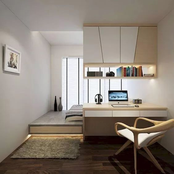 书房客房一体化其实就是在卧室里安装书桌,这设计也不难。整个房间的必需品也就只有床、书桌、书架、凳子这四件家具。只要买自己比较喜欢的款式就好了。
