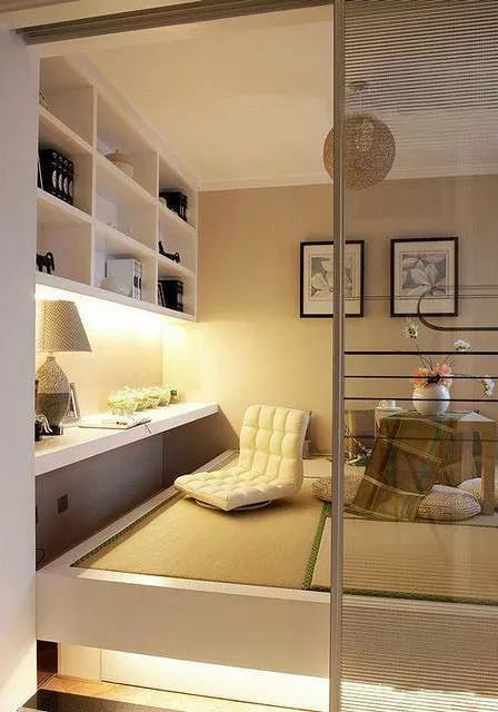 书房客房一体化装修其实可以完全装成一个茶室,茶室的底座是榻榻米。榻榻米可以当做床来睡,除了比较硬的材料没其他缺点。书桌也可以就立在旁边,茶桌就可以当成书桌,旁边房子一个靠墙的书柜,没有柜门上面放着一些比较喜欢的书。在周末的下午可以约两个关系比较好的朋友,喝茶看书晚上的时候就可以直接住在这里。