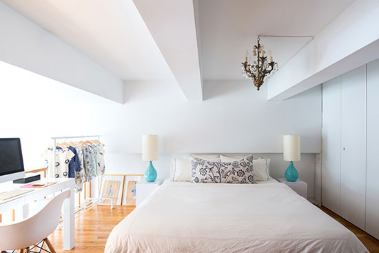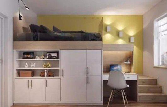 第一点是上床下桌的设计,这种设计就是为了这种空间不够但是需要的功能较多的房间所准备的,而且这个时候的床我们就可以选择用1.8*2.3*1.8的规格,下面可以有衣柜、书桌或者梳妆台。