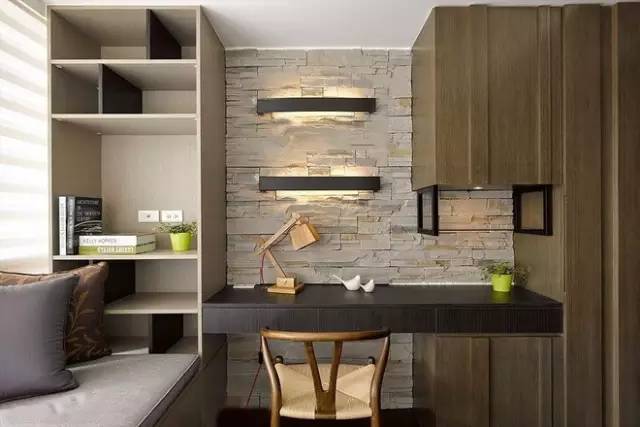 榻榻米的旁边就可以摆放一张书桌,这种书桌主要看房间的大小,可以顺着柜子的那一面墙摆放一张书桌也可以在靠近榻榻米的旁边放一张长条桌,可以有两个人办公。然后书架或者书柜就选择挂壁式的,上面放一些常用的书或者办公文具。