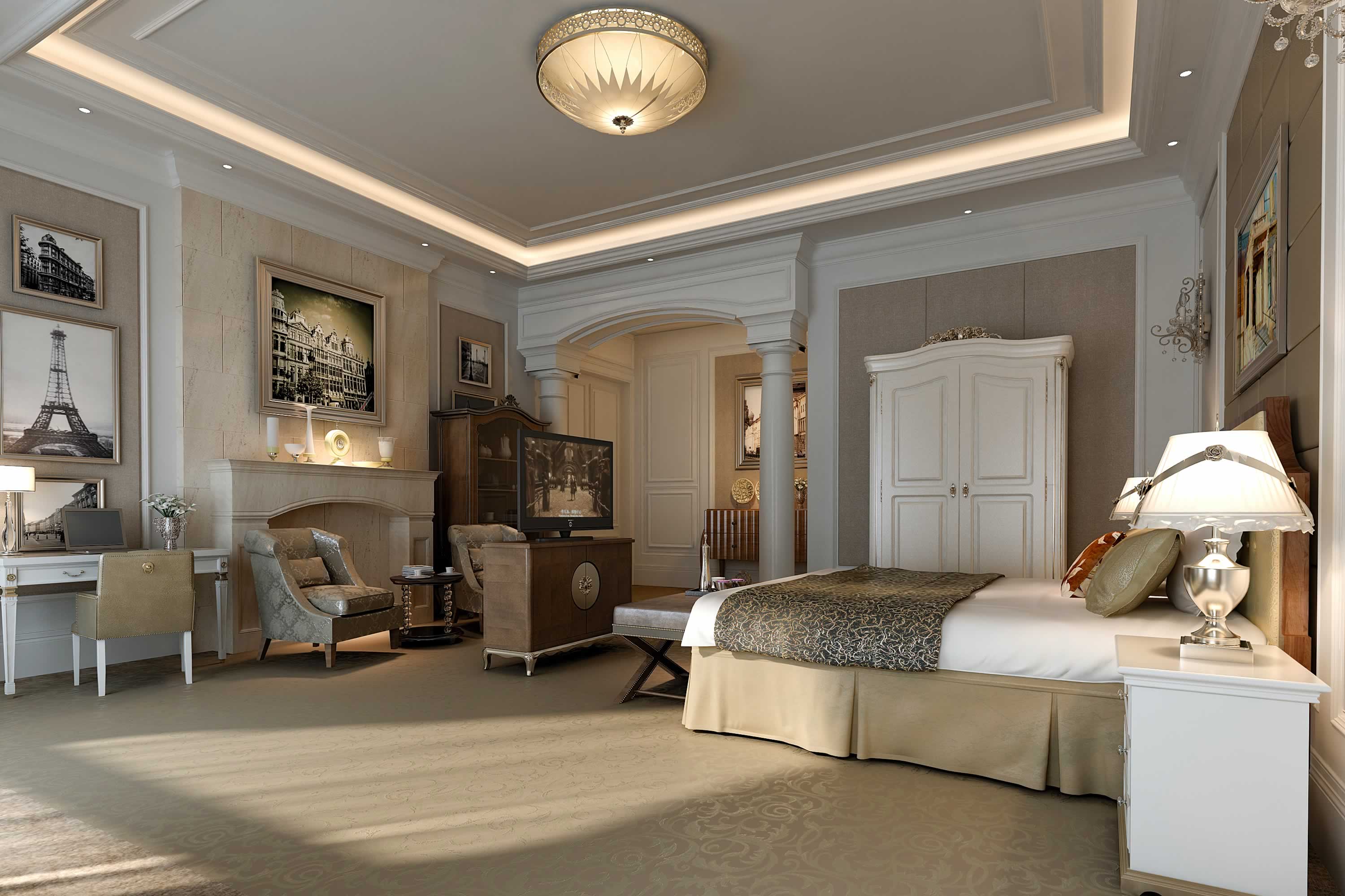 3、墙面。一般来说欧式风格的墙面都是贴壁纸的方式。对于客厅,我们一定要选那种,从视觉上看起来落落大方的壁纸。而卧室可以选择小碎花,提升温馨舒适感。