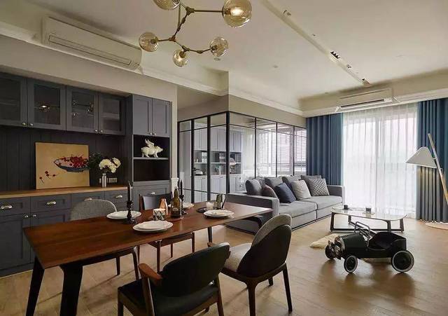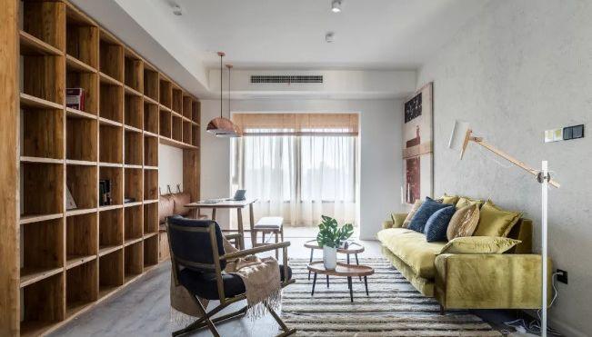 客厅和其他空间的交接地带,充分利用隔断做书架收纳,可有效放大空间,客厅兼书房功能合理变换。还有沙发旁的空间,选择一款可以移动的小书架,和客厅的整体风格一致,既实用又是很好的装饰。