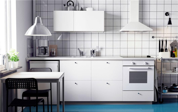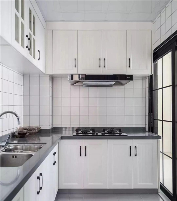 我觉得小厨房装修适合简单要一点的装修风格,在色调方面可以以单色调、浅色系为主;在白色装修的整体环境中,选用亮面白色橱柜,能够将两者充分融合在一起,视觉上产生一体感,从视觉上放大了厨房面积。