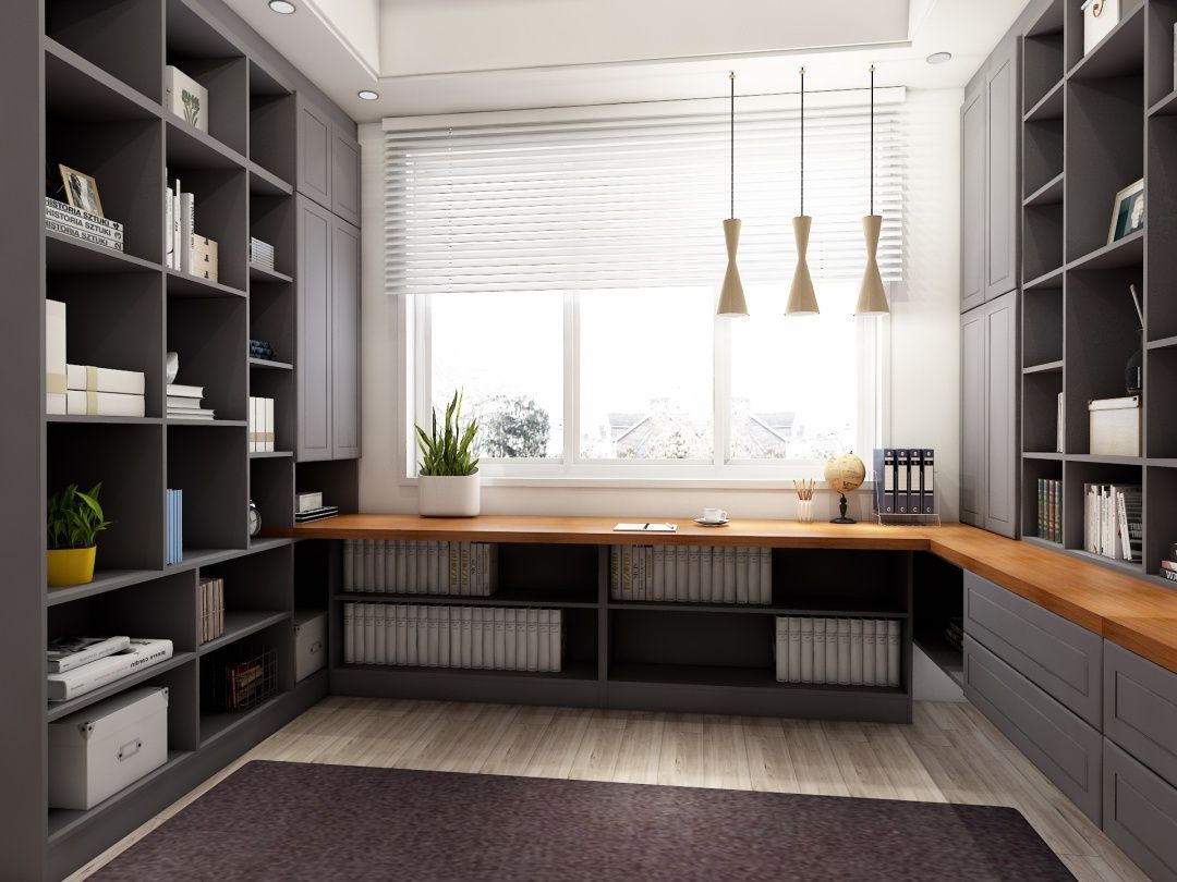 书房作为需要人们极度专注的空间,安静是必须的,因此装修的时候要就要优先考虑隔音问题。一般是从硬装或软装上下手,使用隔音材料、隔音效果良好的门窗或者利用地毯来吸音。