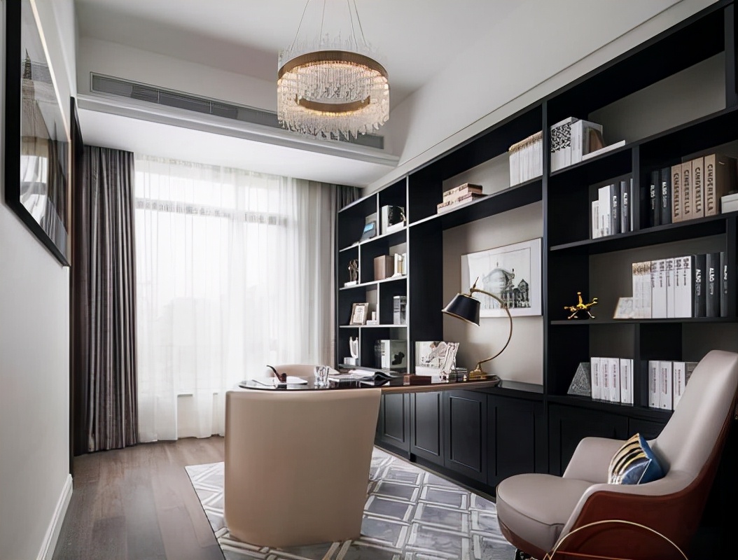 书房最重要的就是安静,不管是工作还是看书都需要一个安静舒适的环境,因此书房必须做隔音处理,在装修过程中应该选用一些隔音、吸音效果更好的装饰材料,墙壁采用pvc吸音板或是软装配饰,地面上可以采用吸音效果较好的地毯,窗帘选用质地较厚的材料,也可以起到隔音效果。