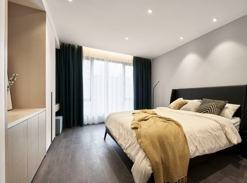 房间的窗帘考虑遮光度,选择厚实一点布料或者带有遮光层的窗帘。