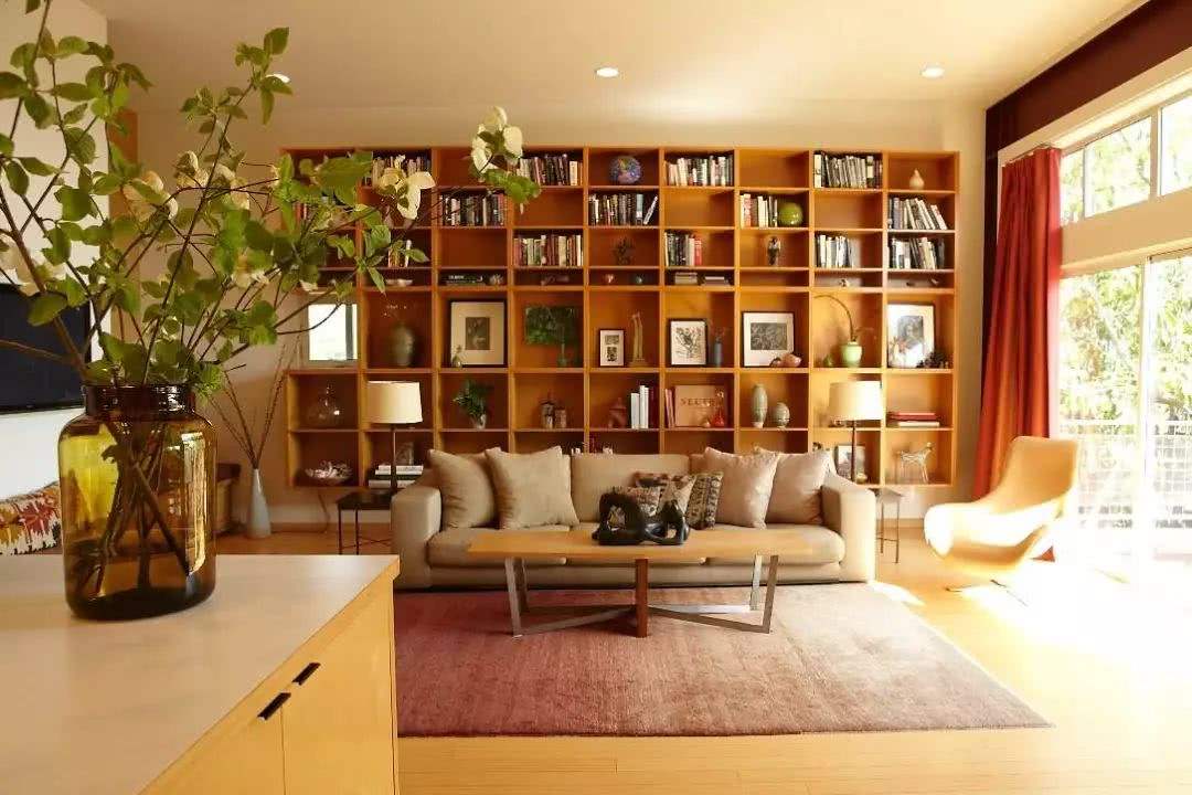 当然了,书柜不一定需要占据整面墙,如果客厅面积不大,像下图这样,选取部分墙面做书架也很好看。