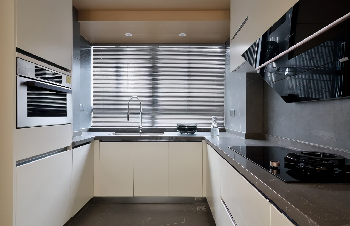 3、内嵌不占道,实在放不下可以外移,选择好电器,做好尺寸预留,厨房内的电器做成嵌入式的,美观又不占位置。特别是小厨房,能更好保证过道的“宽敞”,烹饪的时候更方便。当然,一些大电器实在放不下的话,可以外移内嵌到餐边柜当中。