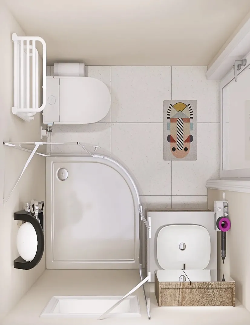 卫生间面积太小,不需要有太多的装修设计,重点要放在如何将空间最大化合理地利用起来,最简单的设计方案就是全屋贴白色瓷砖,显得干净、宽敞,再在墙面做一些嵌入式的壁龛,不用买各种五金挂件,省空间。