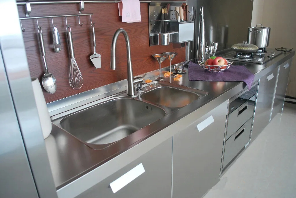 不锈钢橱柜,简单说就是用不锈钢为材料制作的橱柜。这种橱柜多是一体成型的(指台面与柜体是一体),因此它安装起来比较容易,不需要使用螺丝,可以达到快速组装的效果。即使我们是长期使用,它的表面也不会出现开裂、变形等现象,也不会有缝隙,不会滋生细菌,可以让我们的烹饪环境更干净卫生。