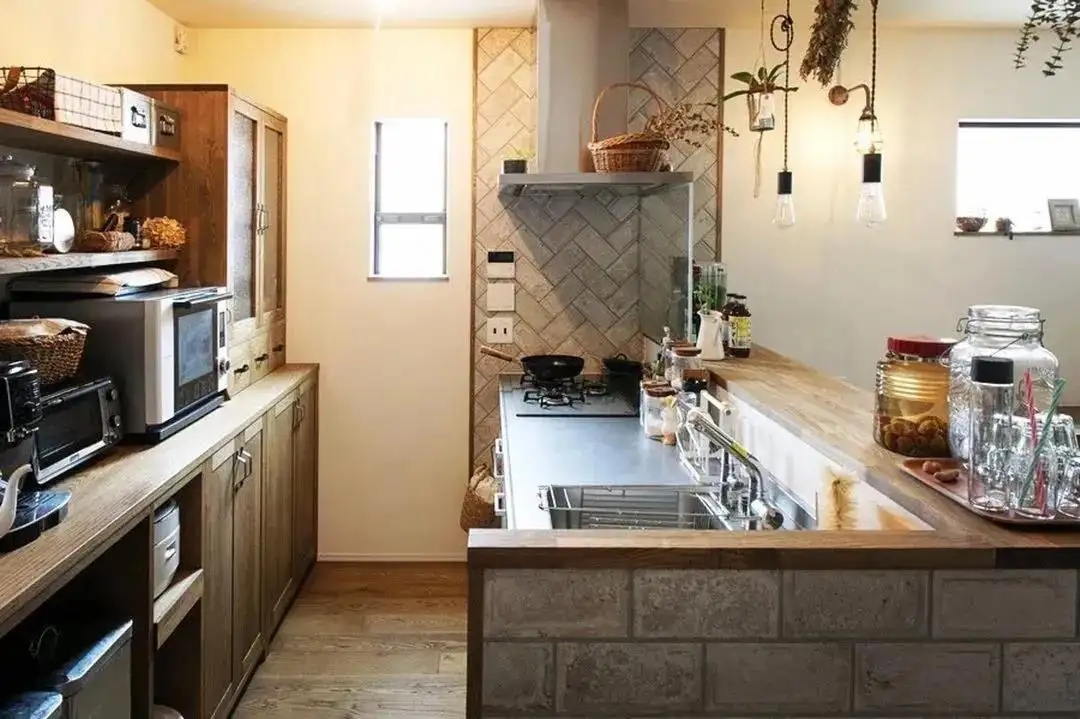 高低操作台是一个非常实用的厨房设计要素,把灶台区做低点,这样做饭的时候不用架着手;把水槽区做高点,这样洗菜洗碗的时候不用弯腰驼背。