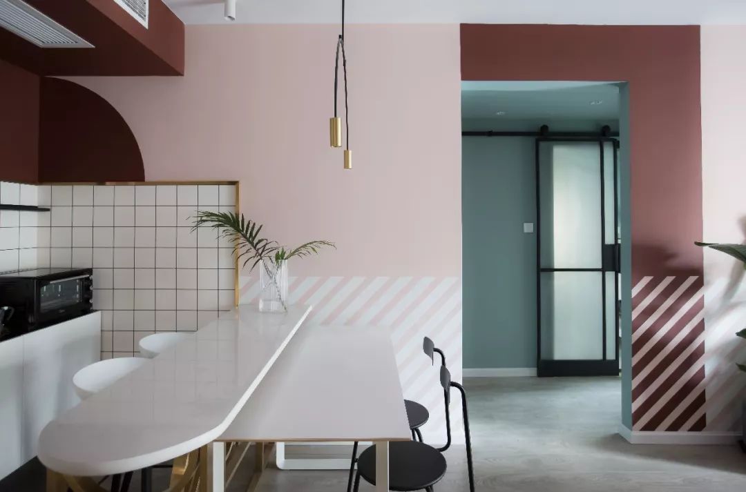 餐厅采用吧台的框架使用了几何分割的设计,配合墙面的构成元素,黄铜色的加入提升空间精致感。