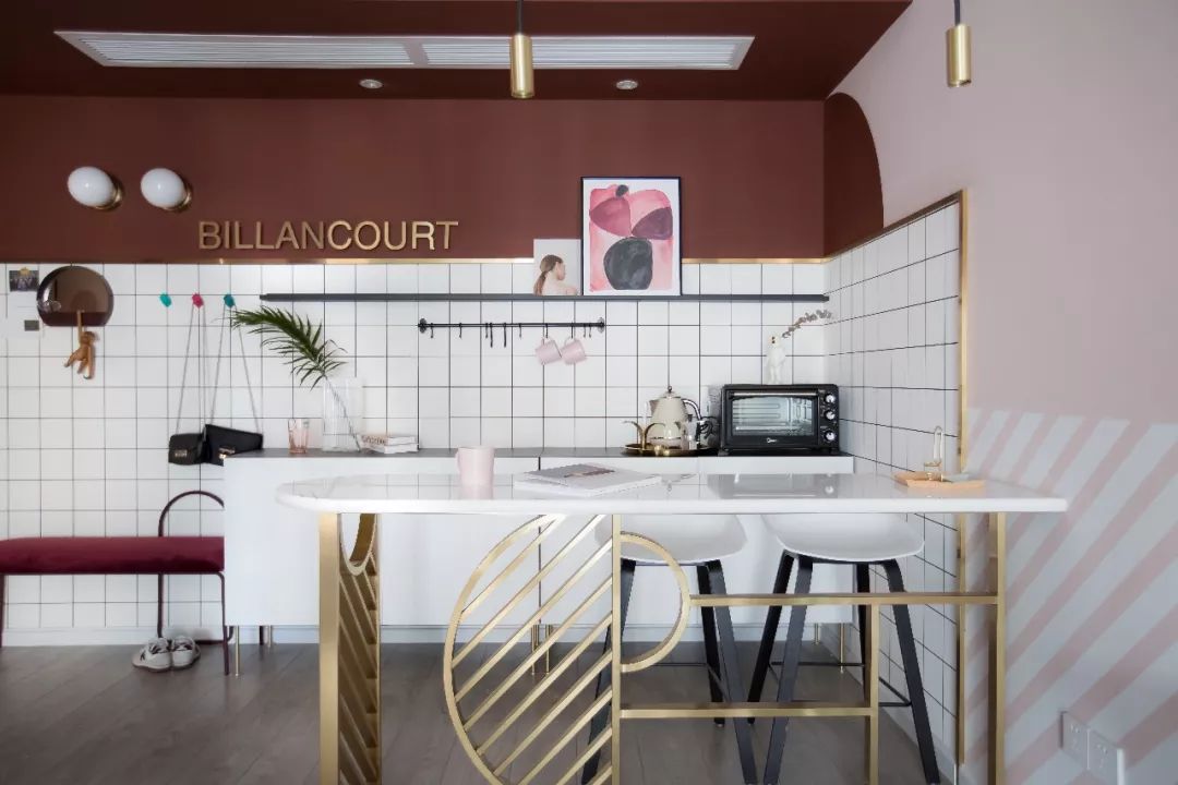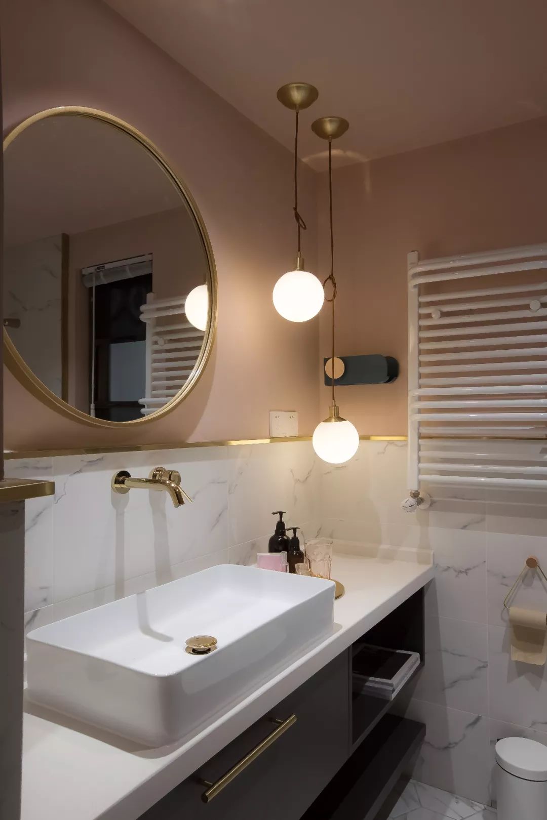 主卫是粉色系的空间配色,利用仿爵士白墙砖搭配复古简约的球形吊灯,多了一抹摩登时尚情怀。