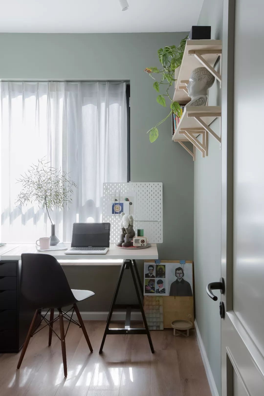 书房的配色非常自然清新,简约的书桌、墙面置物架、洞洞板等营造了一个自由而舒适的静思空间。