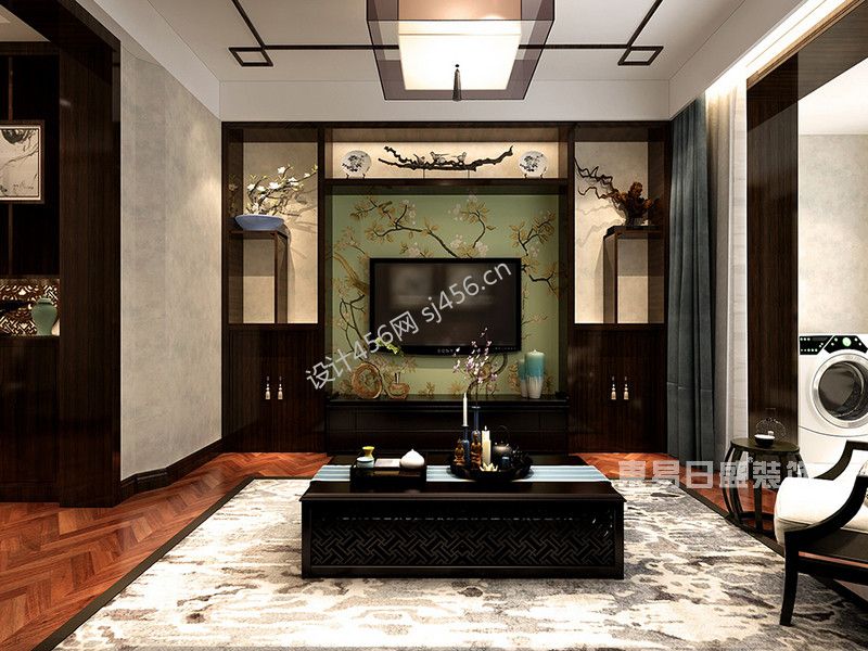 详情紫金华府86㎡新中式风格电视墙装修效果图