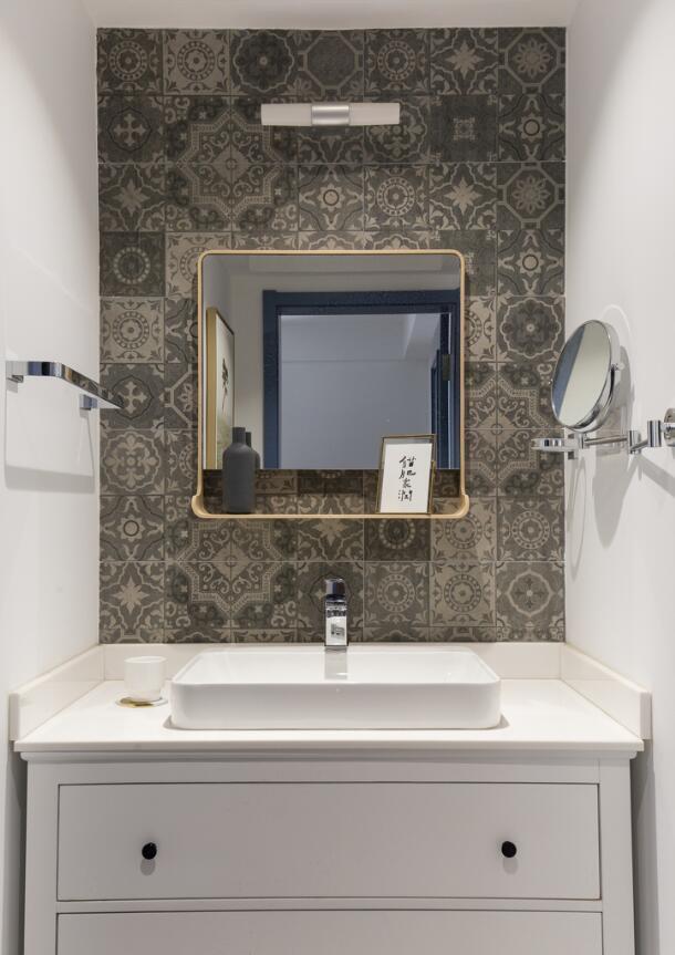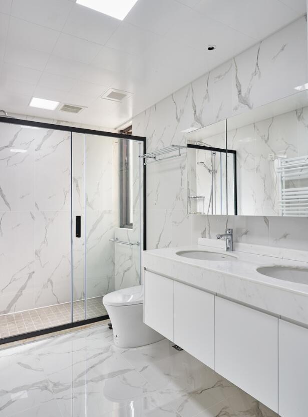 3、洗漱台做到1.5米一般来说我们在洗脸洗头的时候,也难免会将一些水污溅到周围的墙面上。所以对于这一区域我们最好也要加高防水的高度。