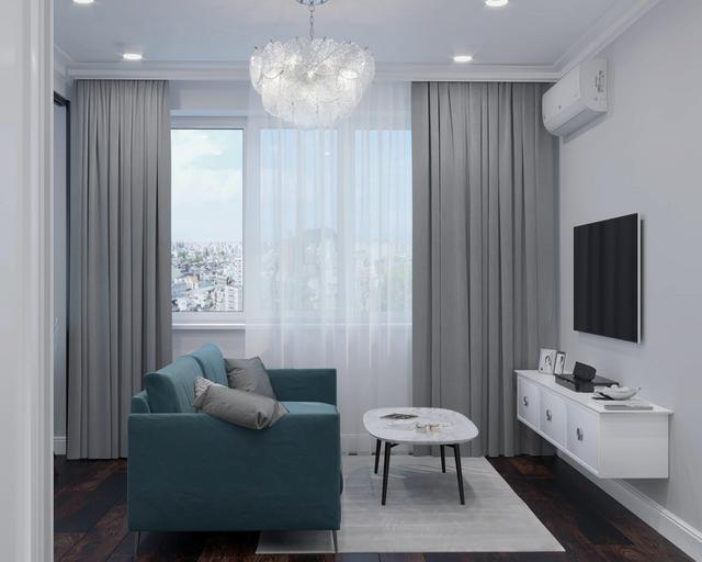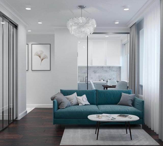 客厅,电视墙直接粉刷为白色,电视柜也是简单的白色装柜,收纳兼展示柜。一张蓝色的蓝色沙发以及一张简易茶几,就是客厅的全部,简约现代风格设计,却也实用。