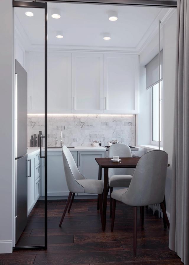 餐厨的设计,空间虽然小,但是功能齐全,以白色为主色调的设计使得空间更加的通透明亮,防溅挡板选用大理石纹的瓷砖设计,白色的欧式风格橱柜也是相当不错的搭配,时尚优雅。