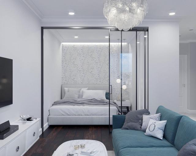 客厅和餐厨、客厅和卧室之间都是用玻璃移门隔开,既可以作为相对独立的小空间,白天还可以都把玻璃门打开,就成为一个通透的小蜗居。