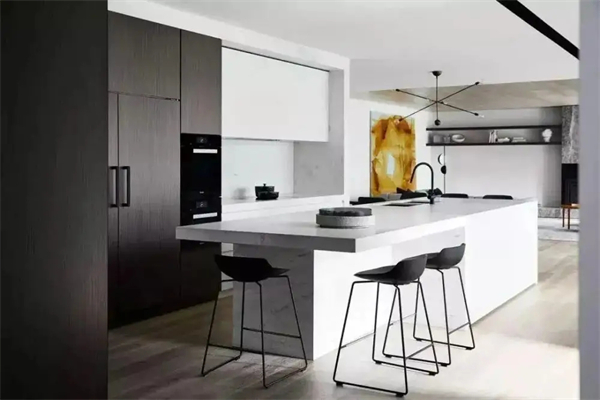 现代居室装饰,多以简约现代的风格为主,与开放式厨房搭配,更显时尚。而且现在一般户型的厨房面积都不会太大,做开放式厨房能使空间在视觉上变大,使空间更好利用。