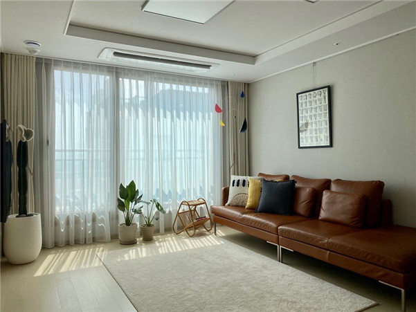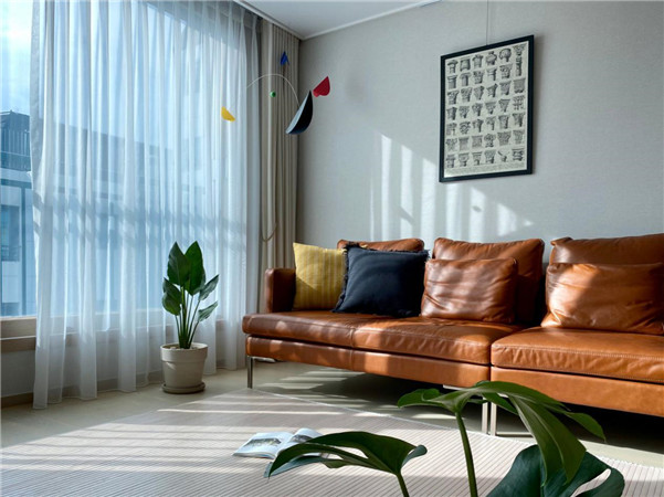 棕色的皮质沙发很有欧洲复古的感觉,旁边的窗帘选择和墙面同色系象牙色,双层遮光,白天还自带朦胧感。所以每天待在家里客厅的时间是最多的,采光好能够得到好的放松休闲。