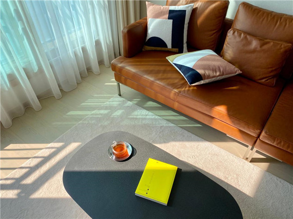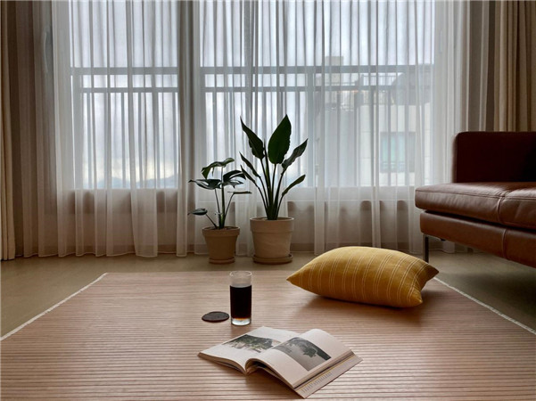 在客厅的中间铺上地毯,有时候席地而坐,背靠沙发,就可以享受最自然放松的状态。