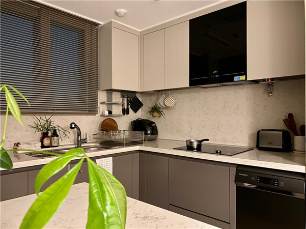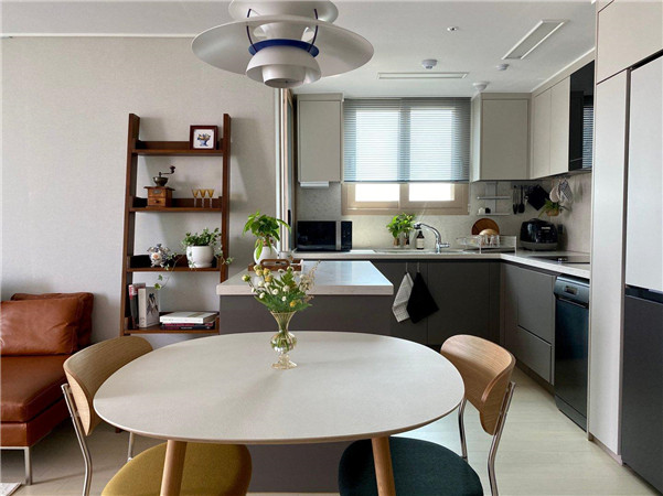 所以说房子硬装完的优势就在这了,橱柜岛台都打好设计好了,俩人在岛台旁边放张圆桌,就规划出了餐厅。