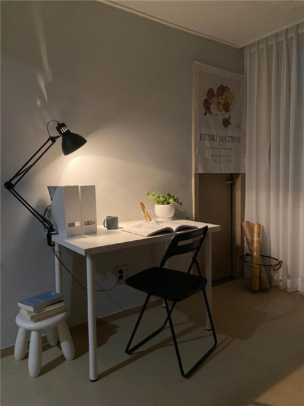 剩下2间房,因为俩人都会有在家办公的需求,所以一间是家里办公的书房,书柜、书桌选的都是比较沉稳中性的木质材质。桌上搭配上复古的台灯,颇有氛围!