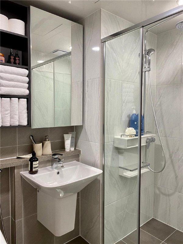 卫生间里的布局设计都没有变,洗漱台上面有壁挂的镜面柜做收纳,紧贴着淋浴区也有玻璃门隔断,所以对于卫生间屋主俩也是非常满意的。