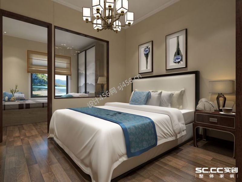 新中式风格四居室140平卧室窗帘装修设计图
