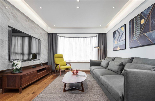 浅灰调的墙面,搭配暖灰调的沙发、窗帘,再配以胡桃原木地板及跳色单椅,整体感觉素雅。