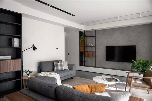 灰色的沙发半围绕着整个客厅区域,将这样一个小空间营造的舒适又温馨。另一边的茶几与沙发凳背对窗摆放,营造出一个休闲舒适的氛围感。