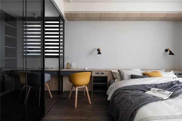 书桌与柜子相连,可以用来摆放书籍拿取方便,向后是一个步入式的衣柜,足够摆放主人的衣柜。深色的玻璃窗在分割功能区的同时还保持了空间的通透性。