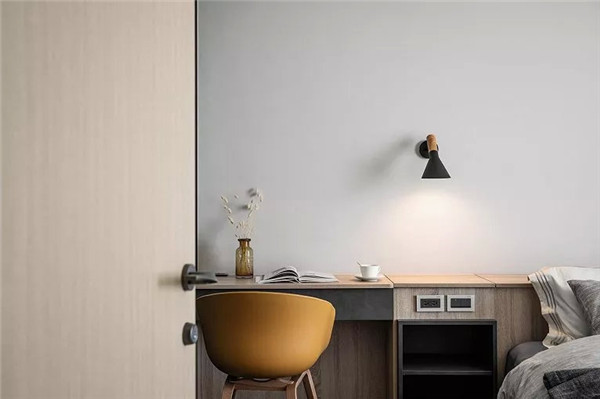 主卧以木色与白色为主色调,显得清新又舒适,灰色的床单与白色被套使整个床铺很清爽又透着安静的氛围更利于睡眠。