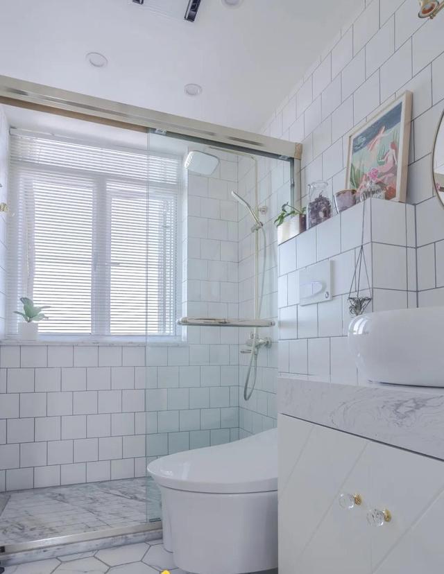现在的壁挂马桶越来越流行,砌墙后的顶部留10cm小平台就可以利用起来,在上面摆放绿植或者沐浴用品很方便。