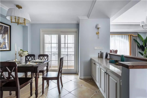餐厅,餐桌椅延续经典美式的深棕色,靠墙摆放可以留出更为充足的过道空间。