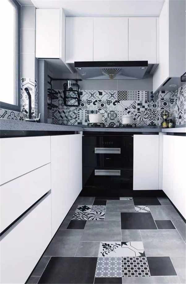 厨房的墙面一般比较单调,实用性远远胜过了装饰性,因而没有太大的亮点。如果用花砖进行装饰,和其他单色砖形成一个视觉上的对比,或许就能轻松打造视觉焦点了。