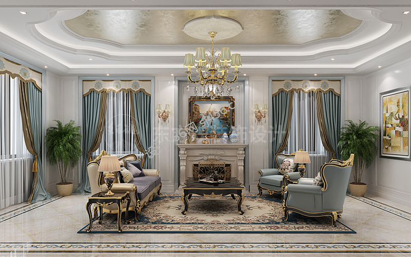 混搭中式风格650平别墅客厅背景墙装修效果图
