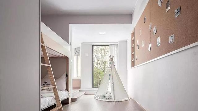 儿童房墙壁上采用了时下非常流行的高级灰色,搭配浅色的实木地板装饰,能够让室内显得非常沉稳大气,上下床非常精致小巧,搭配舒适度的被褥,能够轻松容纳两个孩子休息。在靠窗的位置还摆放一顶精美的小帐篷,闲暇的时候可以晒晒太阳喝杯咖啡,能够让生活更加惬意舒适。