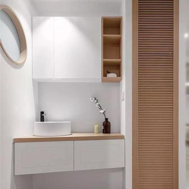 在卧室门口还打造了一间精美的浴室柜,浴室柜非常精致,采用壁挂的安装方式,搭配一组吊柜,能够提供非常好的储物空间,从而将零散的洗浴用品整齐的收纳起来,日常拿取使用也更加便利。在浴室柜旁边还打造了入墙式的储物柜,柜子设计的非常精致巧妙,能够轻松收纳一些小件物品,能够让室内显得更加整齐有序。