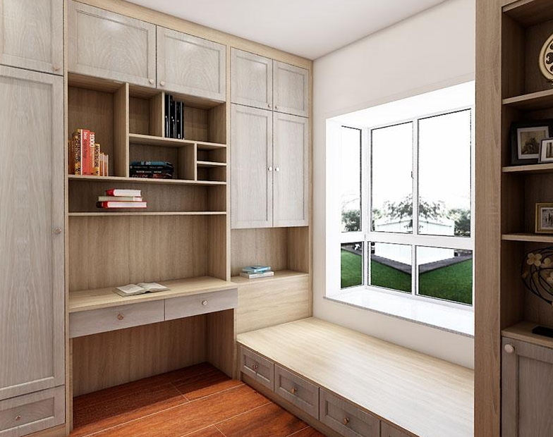 3、如何将全铺的空间,变为书房、客房、休闲房为一体的多功能房呢,书房部分,可房间左或右侧地面留出一个地面空间,在其上方的墙面固定好桌板,做成书桌形式,书桌上方的墙面也可铺排书架,这样便能在留出工作区域的同时也不破坏榻榻米的整体性。