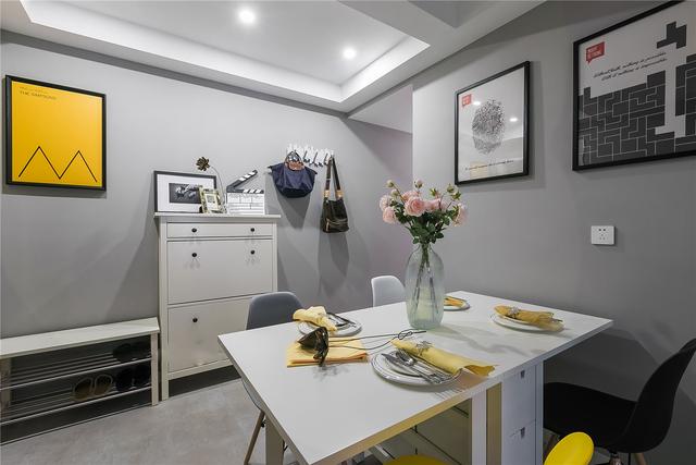 餐厅与玄关空间也是紧凑设计,靠墙的地方搭配的是鞋柜和储物柜,可以实现大容量收纳,保持玄关的整洁干净有序。为了进门挂放衣物的方便性,安装了一个简易的衣帽架,可以实现包包和一些衣服的有序挂放。虽然与餐厅只有一点点的距离,但是却一点也不觉得拥挤。