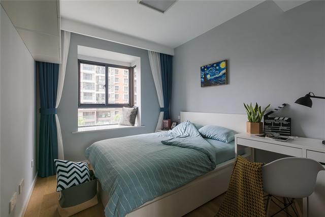 次卧的装修也是十分的素净,简单的搭配了一张床和办公桌,简单的设施搭配不占用空间。窗台也是带有一个小飘窗,简单的布置了一下,不仅采光显得好同时也也能当做一个休闲的空间。次卧以后用来当做客房很不错,简简单单又比较休闲舒适。