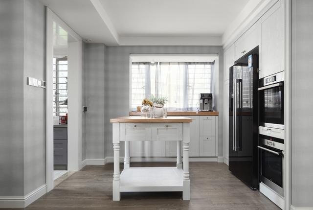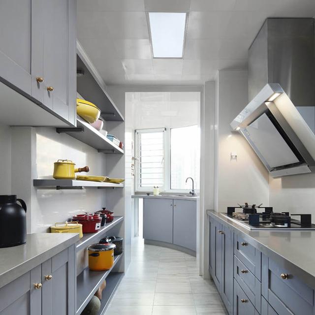 厨房这样设计显得非常精致紧凑,橱柜根据户型量身打造,搭配一组吊柜,将厨房的空间非常好的使用起来,能够将厨房的物品分门别类的收纳起来,使得室内显得更加整齐大方,日常拿取使用更加办理。把阳台也改造成厨房的一部分,也极大地拓宽了厨房的面积,让人感觉更加轻松。