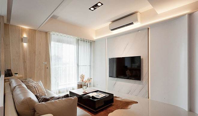 9、大面积的电视主墙面,可以选择浅色系的天然大理石材,对整体空间能有放大的效果。