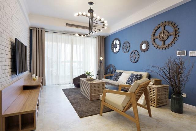 生活需要情调,装修巧妙融入一些时尚元素,为家人营造出一种温馨浪漫的生活环境。沙发背景墙采用深蓝色的格调,还装饰了一些精致的艺术品,从而使得客厅看上去更加清爽又浪漫,让家人生活更加开心。