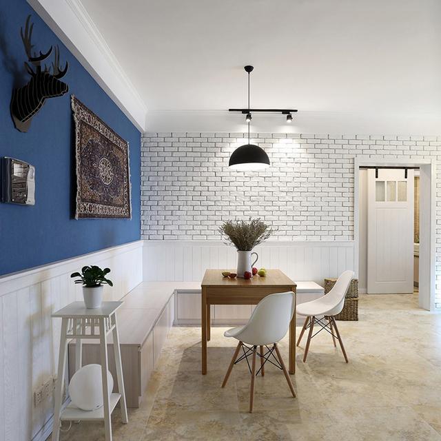 餐客厅之间采用开放式的设计,中间并没有采用任何隔断,这样一来将大户型的优势充分地彰显了出来,显得非常敞亮大气。在餐厅还设计了精致的卡座,呈L型设计,卡座本身还有储物格设计,既实用又能容纳更多人吃饭用餐。另外在餐厅背景墙上还采用深蓝色的格调,加上一些艺术品点缀,有一种美式风的粗犷大气,彰显出了家人的品味与情调。