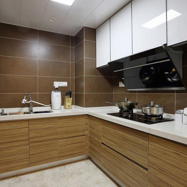 厨房墙壁采用咖啡色的格调,搭配白色的缝线,非常大气奢华有线条感,抗污能力也是非常不错的,日常打理起来也更加方便。浅色的实木橱柜非常精致,呈L型摆放安装,搭配浅灰色的大理石台面,非常大气有档次感。搭配一组精致的吊柜,能够为厨房提供非常好的储物空间,将零散的厨具整齐的收纳起来,日常拿取使用也更加便利。