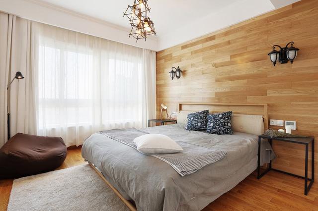 主卧床头背景墙采用浅色的实木扣板装饰,在床头还安装了两盏精致的壁挂灯,使得卧室显得非常时尚有情调。卧室的大床采用新中式风设计,搭配浅灰色的被褥,床头两把各摆放了一个小茶几,非常素雅时尚,躺在大床上透过窗户也能看到外面美丽的景色,能够让人从心里得到非常好的放松。