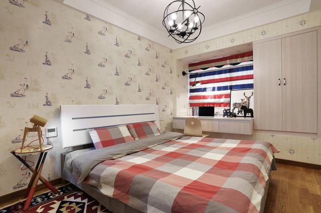 相比之下次卧装修的更加年轻有活力,就像床头的壁画,小帆船的图案让卧室显得更加年轻有活力。白色的大床简单大方,搭配条纹的被褥,非常温馨有家的感觉。飘窗做了改造,改造成一个小书桌,采用壁挂的安装方式,与旁边的衣柜很好的搭配在了一起,既美观又实用,很是值得借鉴学习。